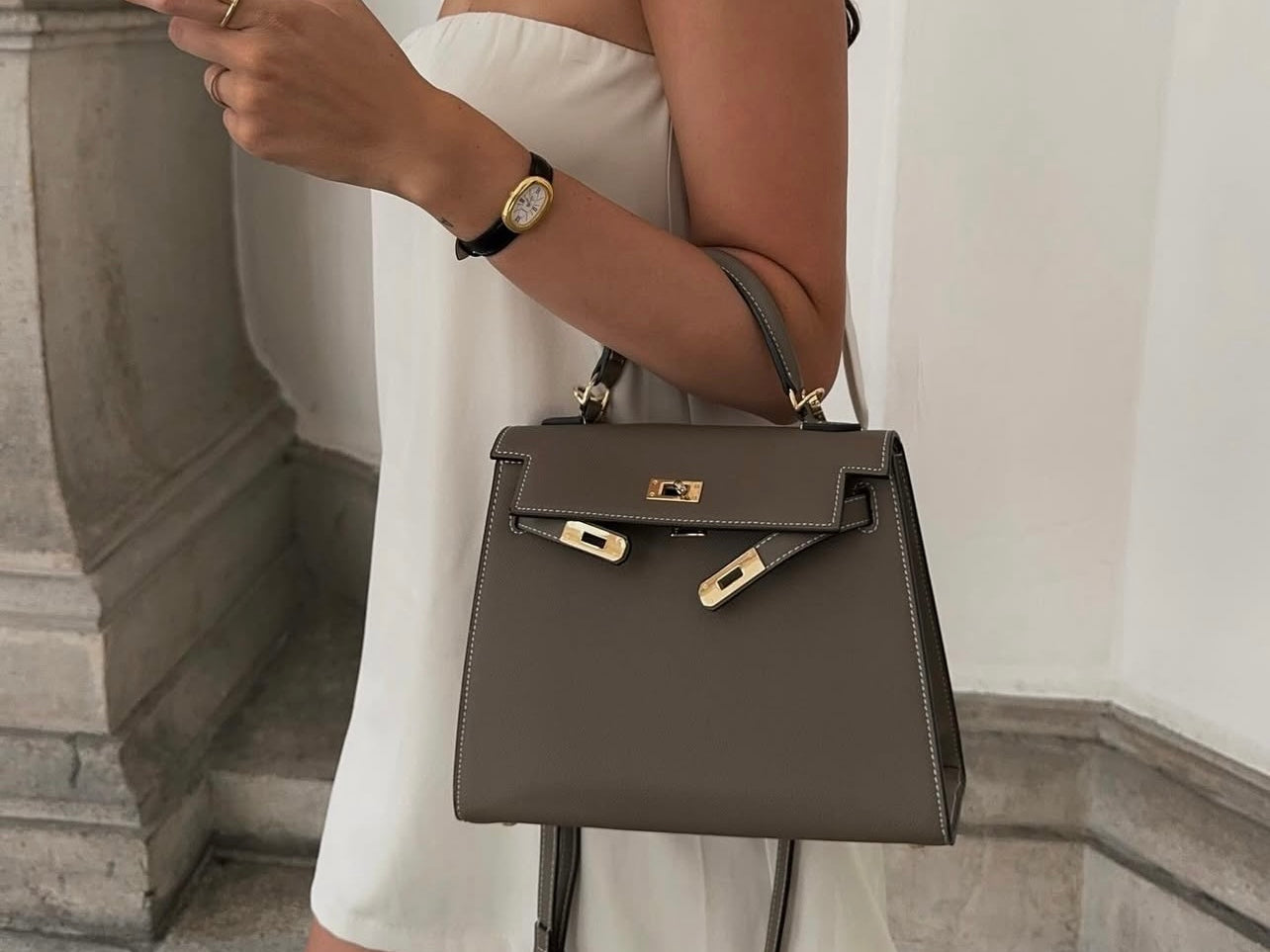 Premium full-grain calfskin leather finished with elegant gold-tone hardware.